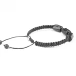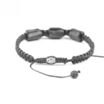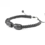 Bransoletka – 3 kamienie Naturalny turmalin. Dzięki zastosowaniu węzła typu makrama ma możliwość regulacji długości i bardzo łatwo dopasuje się do każdego nadgarstka. Bransoletka jest wykonana z czarnego sznurka nylonowego o grubości 1 mm, który jest zarazem delikatny i wytrzymały. Na jego końcówkach znajdują się koralikami z czarnej lawy o średnicy 8mm.