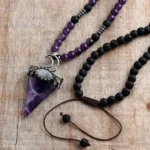 Ten wyjątkowy naszyjnik łączy duchową głębię ametystu z surową siłą kamienia lawowego. To harmonijna kompozycja dla tych, którzy poszukują wewnętrznego spokoju, równowagi i kontaktu z ziemią.